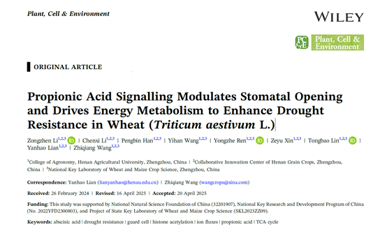 河南农大王志强教授团队近日在《植物、细胞与环境》期刊发表研究成果,首次系统揭示了丙酸作为一种新型信号分子,通过调控能量代谢、激素信号与表观遗传网络,显著增强小麦抗旱性的多重机制。 研究发现,在小麦祖先种节节麦中,干旱胁迫会诱导丙酸显著积累。