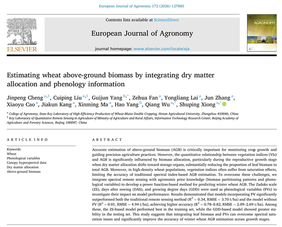 近日,我院熊淑萍教授团队近日在国际期刊《European Journal of Agronomy》(IF=5.5)在线发表了题为Estimating wheat above-ground biomass by integrating dry matter allocation and phenology information的研究论文。该研究提出了一种融合光谱遥感技术