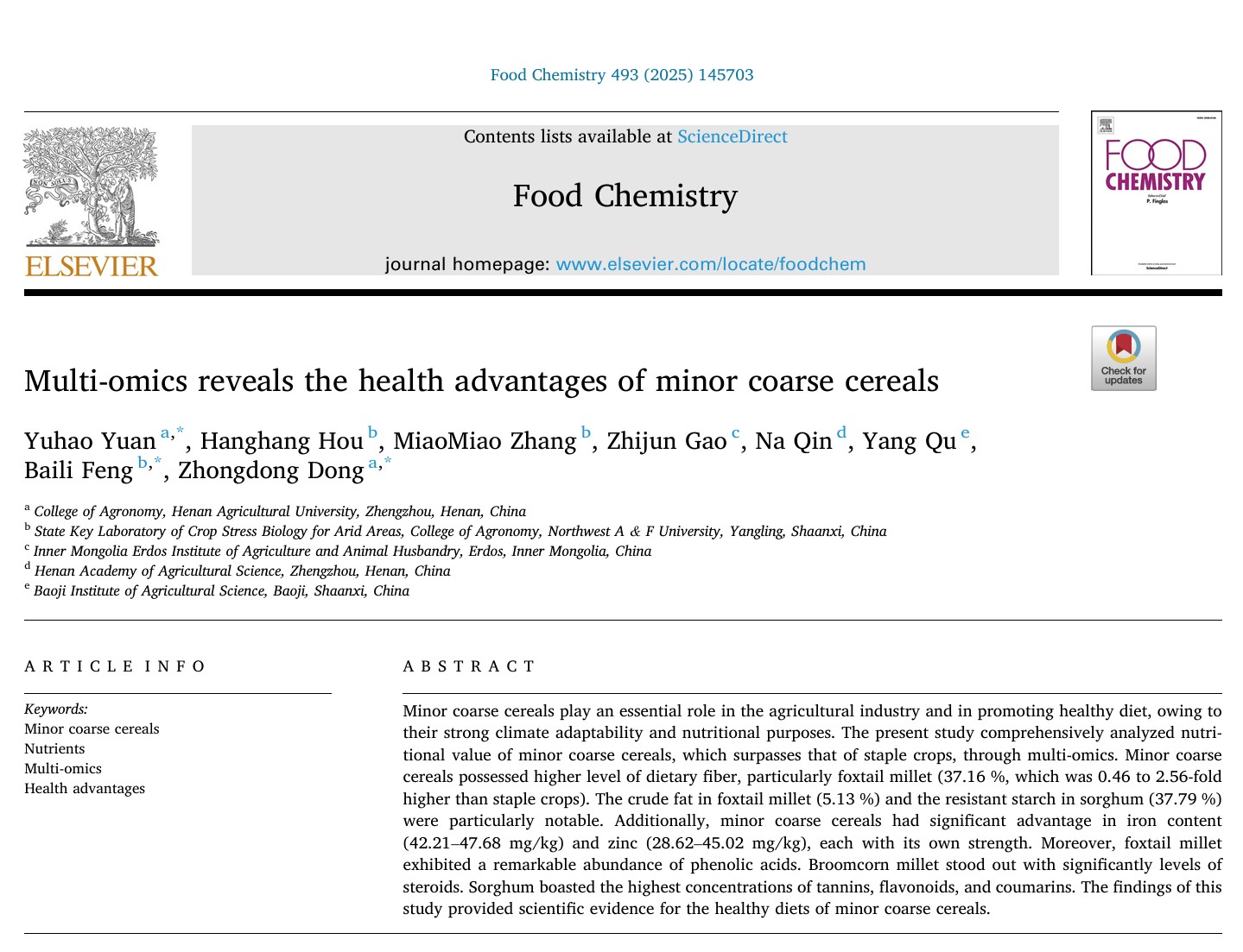 近日,我院袁雨豪联合西北农林科技大学农学院冯佰利教授团队在《Food Chemistry》上发表了题为Multi-omics reveals the health advantages of minor coarse cereals的研究论文。该研究通过基础营养评估、离子组学和代谢组学揭示了杂粮优于主粮的营养健