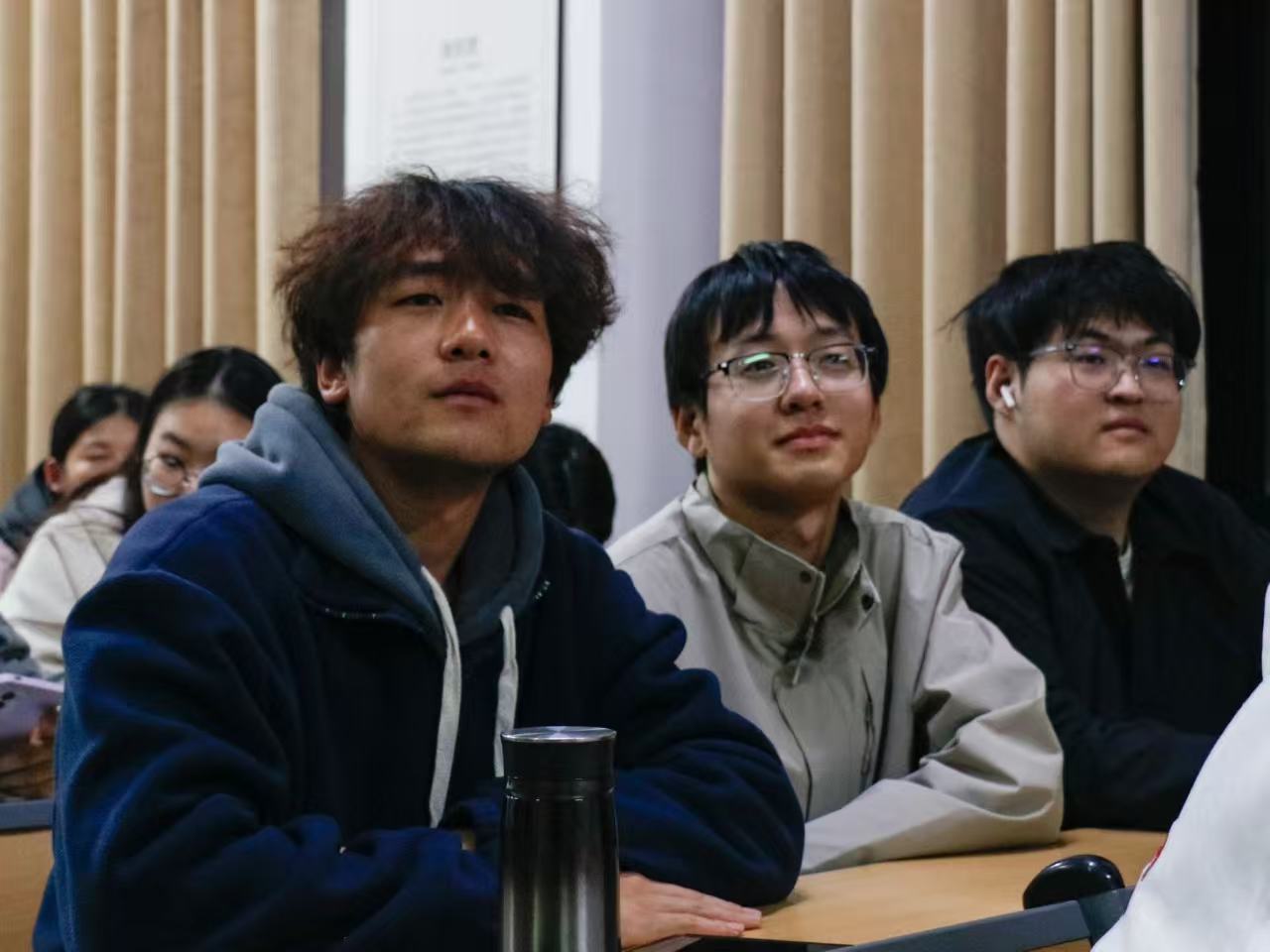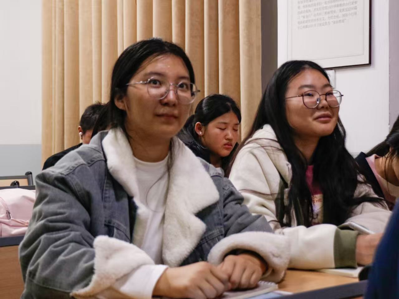 整场观看过程中,现场秩序井然,学生们以专注的状态投入学习,充分展现出对心理健康知识的重视与积极参与的态度。学生们手持纸笔,目光专注地聚焦于投影屏幕。当课程内容涉及情绪调节等实用技巧时,许多学生纷纷同步拍摄直播课件资料,以便后续复习与参考。