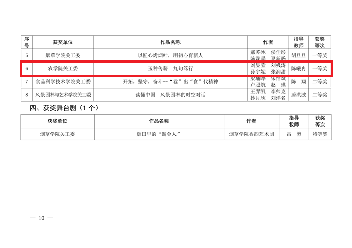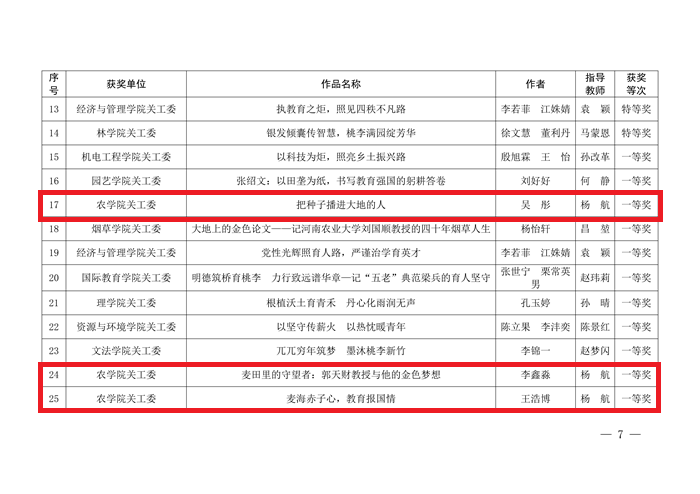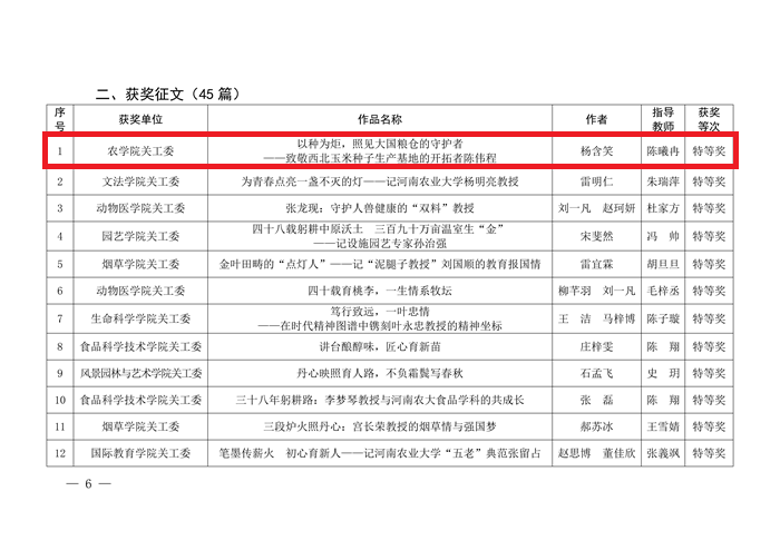 在本次活动中,我院师生佳作频出、捷报连连。其中,由杨含笑撰写,陈曦冉老师指导的征文《以种为炬,照见大国粮仓的守护者——致敬西北玉米种子生产基地的开拓者陈伟程》表现突出,不仅荣获学校特等奖,还拿下河南省教育厅关工委特等奖,更斩获教育部关工委最佳征文奖,成功入围中国教育电视台优秀作品展播。此外,吴彤的《把种子播进大地的人》、李鑫淼的《麦田里的守望者:郭天财教授与他的金色梦想》等10篇征文分别获评学校一、二等奖,刘昱莹等人创作的微视频《玉种传薪 九旬笃行》荣获学校一等奖。我院关工委也因组织有力、成效显著,被评为校级“先进集体”,受到学校表扬。