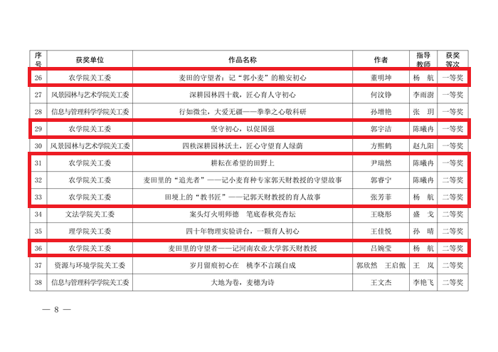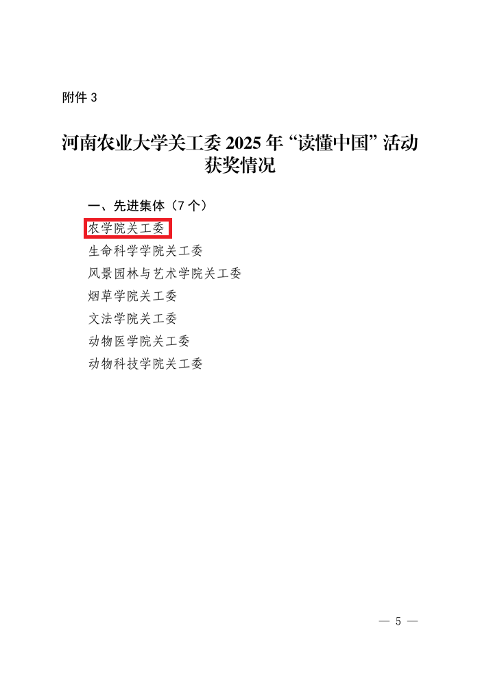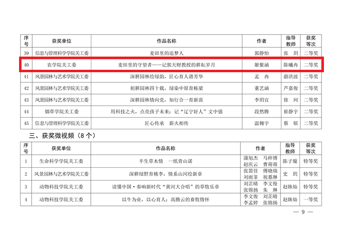 此次获奖作品聚焦“五老”人员的感人故事与崇高品格,生动呈现了我院“五老”专家深耕农业、教书育人的初心与使命,彰显了青年学子传承榜样精神、勇担时代重任的责任担当。下一步,我院将以此次获奖为契机,持续弘扬“五老”精神,搭建更多让师生学习榜样、传承精神的平台,引导广大青年学子在聆听农业先辈的故事、感悟“三农”情怀的过程中坚定理想信念,为学校创建中国特色世界一流农业大学、助力乡村振兴与保障粮食安全贡献青春力量!