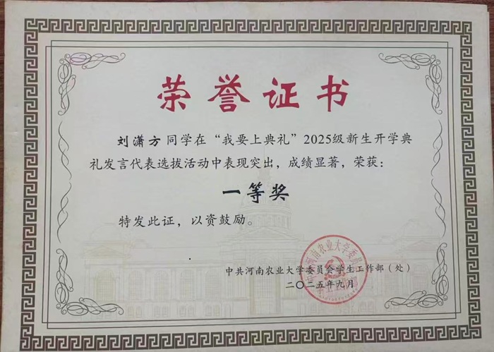 “我要上典礼”2025级新生开学典礼发言代表选拔活动中,我院提前部署、周密安排,从宣传动员、选手筛选,到演讲稿打磨与表达指导,每一步都高效推进,被授予“优秀组织单位”称号。我院新生刘潇方凭借真挚的情感表达、清晰的逻辑条理与饱满的精神状态,在众多选手中脱颖而出,斩获个人一等奖,为学院荣誉榜再添亮色。