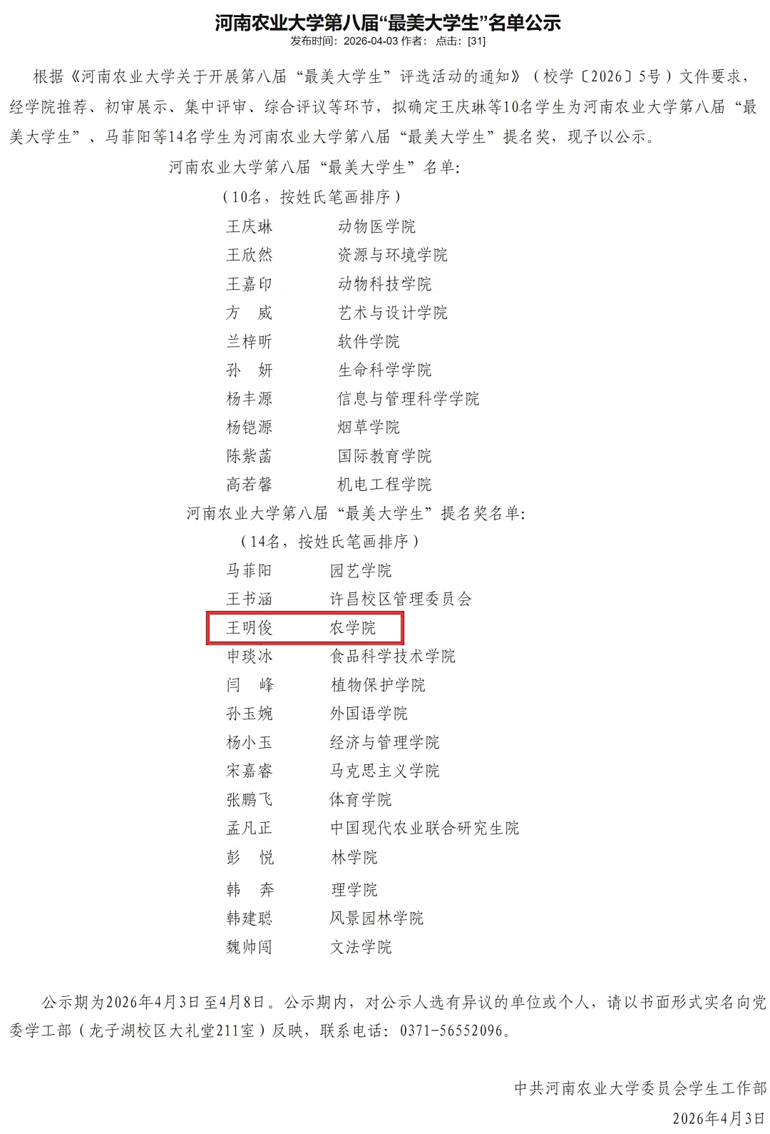 本网讯(通讯员 秦仪雯)近日,河南农业大学第八届“最美大学生”评选活动结果揭晓,我院2023级新农科绍骙创新实验班王明俊荣获河南农业大学第八届“最美大学生”提名奖。