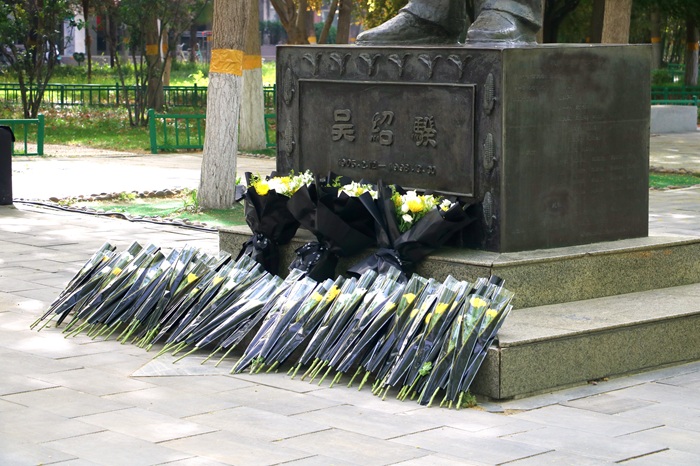 活动伊始,现场师生擦拭吴绍骙先生铜像,随后列队依次献花、鞠躬、默哀,表达对吴老的崇高敬意与深切缅怀。
