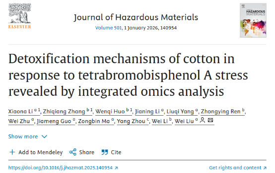 近日,我院刘伟团队在期刊Journal of Hazardous Materials(中科院一区top期刊,IF=11.3)上发表了题为“Detoxification mechanisms of cotton in response to tetrabromobisphenol A stress revealed by integrated omics analysis”的研究论文。该研究揭示了棉花对环境中广泛存在的新型污染物——四溴双酚A(TBBPA)的响应与解毒分子机制,为发展基于植物的绿色可持续修复技术提供了重要的理论依据和创新思路。