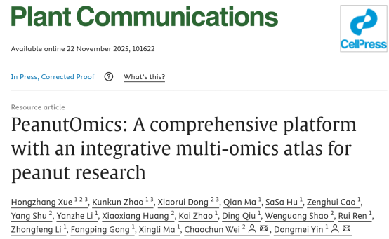 近日,我院殷冬梅教授联合上海交通大学韦朝春教授研究团队,在Plant Communications期刊发表题为“PeanutOmics: A comprehensive platform with integrative multi-omics atlas for peanut research”的论文。该研究构建了花生全生育期22个组织转录组、蛋白质组与代谢组的全景图谱,并推出首个花生多组学数据平台PeanutOmics。该研究为解析花生生长发育机制、挖掘关键功能基因提供了全新工具,将显著加速花生分子育种进程,为保障全球油料作物安全提供重要支撑。