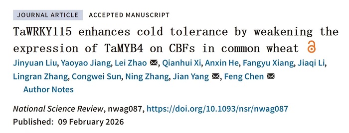 近日,我院陈锋教授课题组/宁波大学植物病毒研究所羊健研究员团队在《National Science Review》(IF=17.1)上发表了题为“TaWRKY115 enhances cold tolerance by weakening the expression of TaMYB4 on CBFs in common wheat”的研究论文。该研究成功克隆了正调控小麦低温抗性的关键基因TaWRKY115,对其基因功能进行验证,并对其作用机制进行解析。该成果不仅为阐明小麦响应低温的分子机制提供新的见解,而且为小麦抗逆育种提供了宝贵的基因资源。