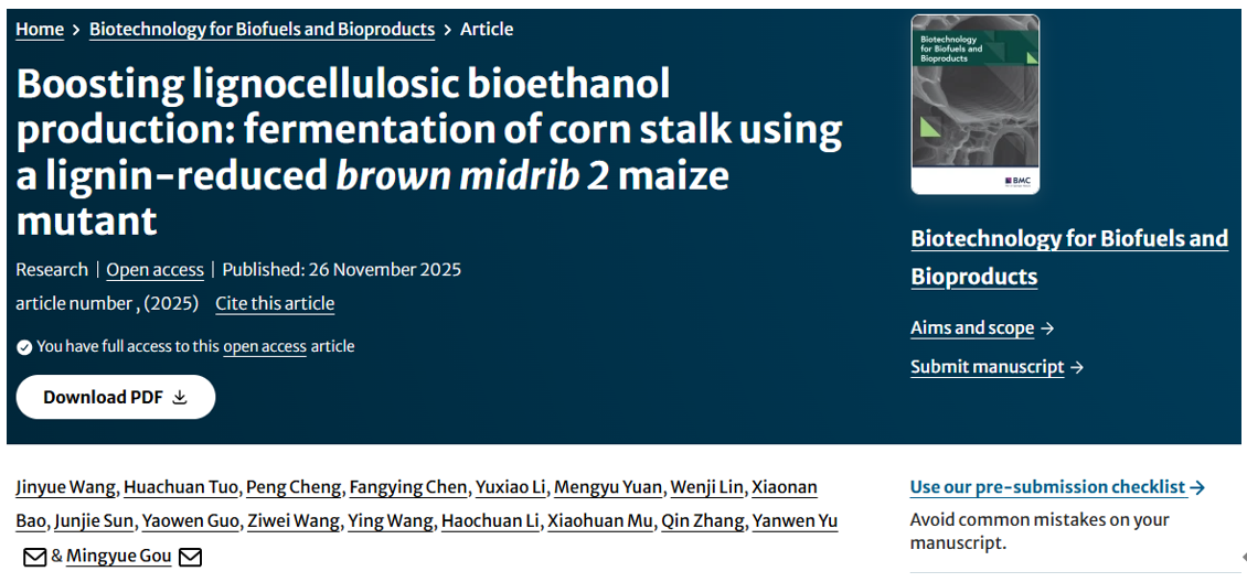 brown midrib 2 maize mutant》,该研究围绕玉米秸秆高效发酵制备生物乙醇的瓶颈问题开展研究,证明降低秸秆木质素含量是提高玉米秸秆生物乙醇生产效率的有效策略,标志着我院在新农科人才培养与农业生物能源研究领域取得又一实质性进展。