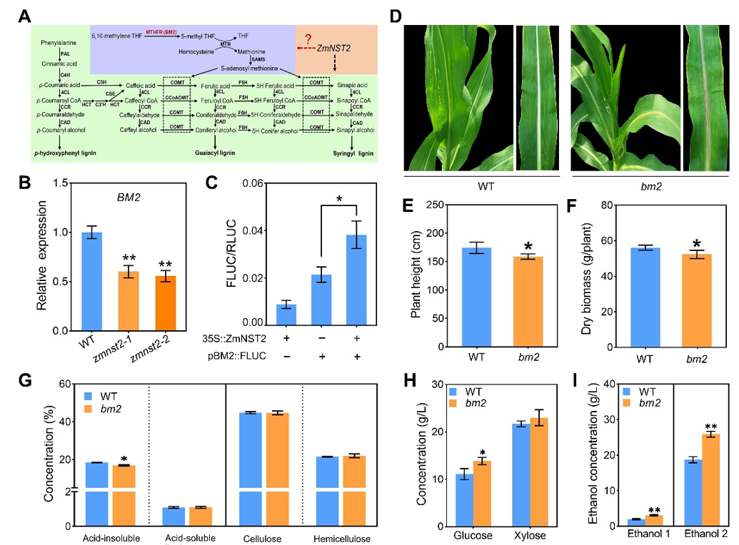 BM2基因(编码亚甲基四氢叶酸还原酶)对玉米秸秆木质素含量和生物乙醇发酵效率的影响。实验结果表明,与野生型相比,