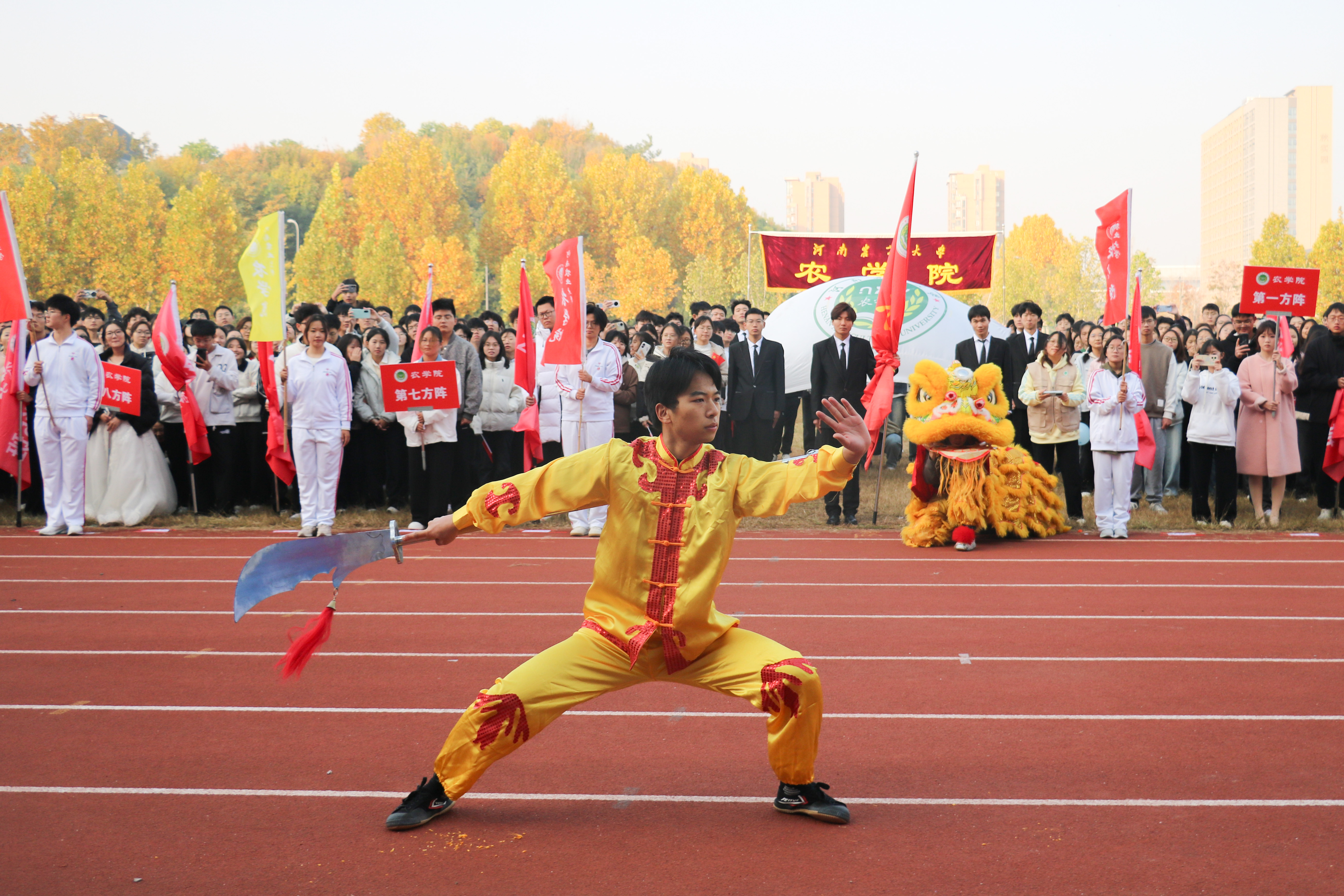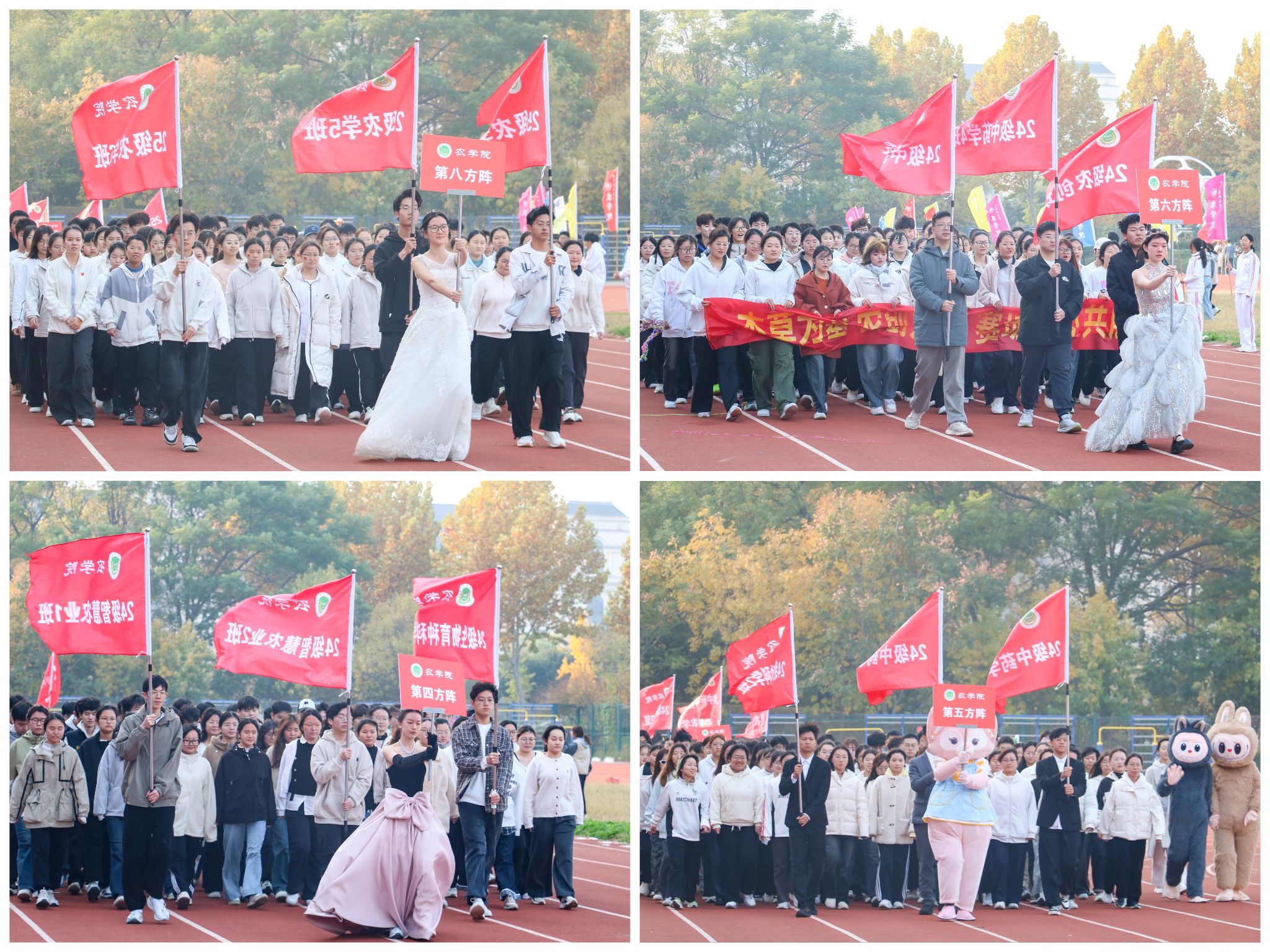 晨光初照运动场,现场已是热闹非凡,一场体育盛宴在开幕式中拉开序幕。国旗队、彩旗队阵容严整,步履铿锵;2024级、2025级本科生方阵朝气蓬勃,意气风发;研究生方阵锐意进取,英姿飒爽;教职工方队神采奕奕,建稳昂扬,依次经过主席台接受检阅。国歌奏响,国旗在全体师生的注视下缓缓升起,现场文艺表演精彩绝伦,燃爆全场,为运动会增添活力与色彩。