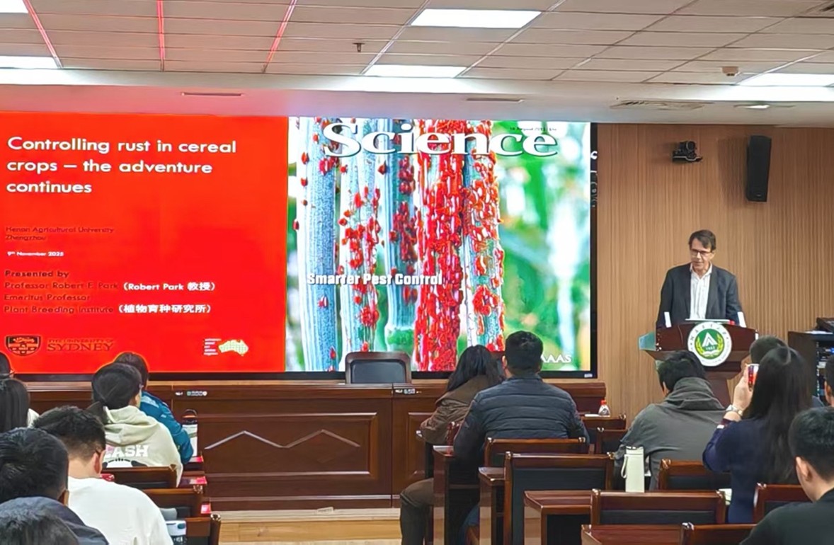 (通讯员 宋林通、段柳、周嘉仪、赵倩雯)2025年11月9日,澳大利亚悉尼大学植物育种研究所(PBI)终身荣誉教授,澳大利亚工程院院士、国家“友谊奖”获得者Robert Park教授应作物学科邀请,做客由河南农业大学农学院(作物学科)、中国现代农业联合研究生院生物育种学部、小麦玉米两熟高效生产全国重点实验室及C1MMYT-中国小麦玉米联合研究中心联合主办的CIMMYT-中国小麦玉米科学创新国际论坛第16期讲座,以“Controlling rust in cereal crops-the adventure continues”为题进行了主旨报告。