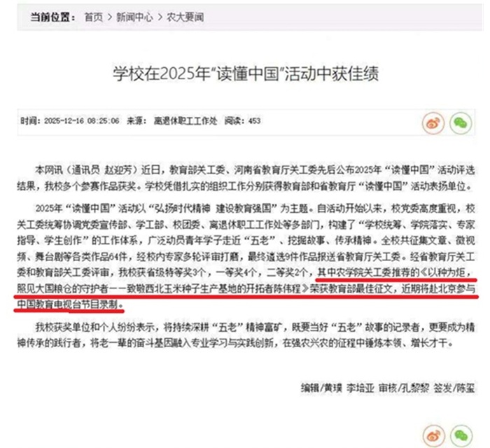 本网讯(通讯员 张涵越)近日,2025年“读懂中国”活动评选结果正式公布,我院作品《以种为炬,照见大国粮仓的守护者——致敬西北玉米种子生产基地的开拓者陈伟程》经校关工委推荐、省教育厅关工委及教育部关工委层层评审,荣获教育部最佳征文奖,该作品作者为我院本科生杨含笑,指导教师为我院团委副书记陈曦冉老师,该作品即将赴北京参与中国教育电视台节目录制!