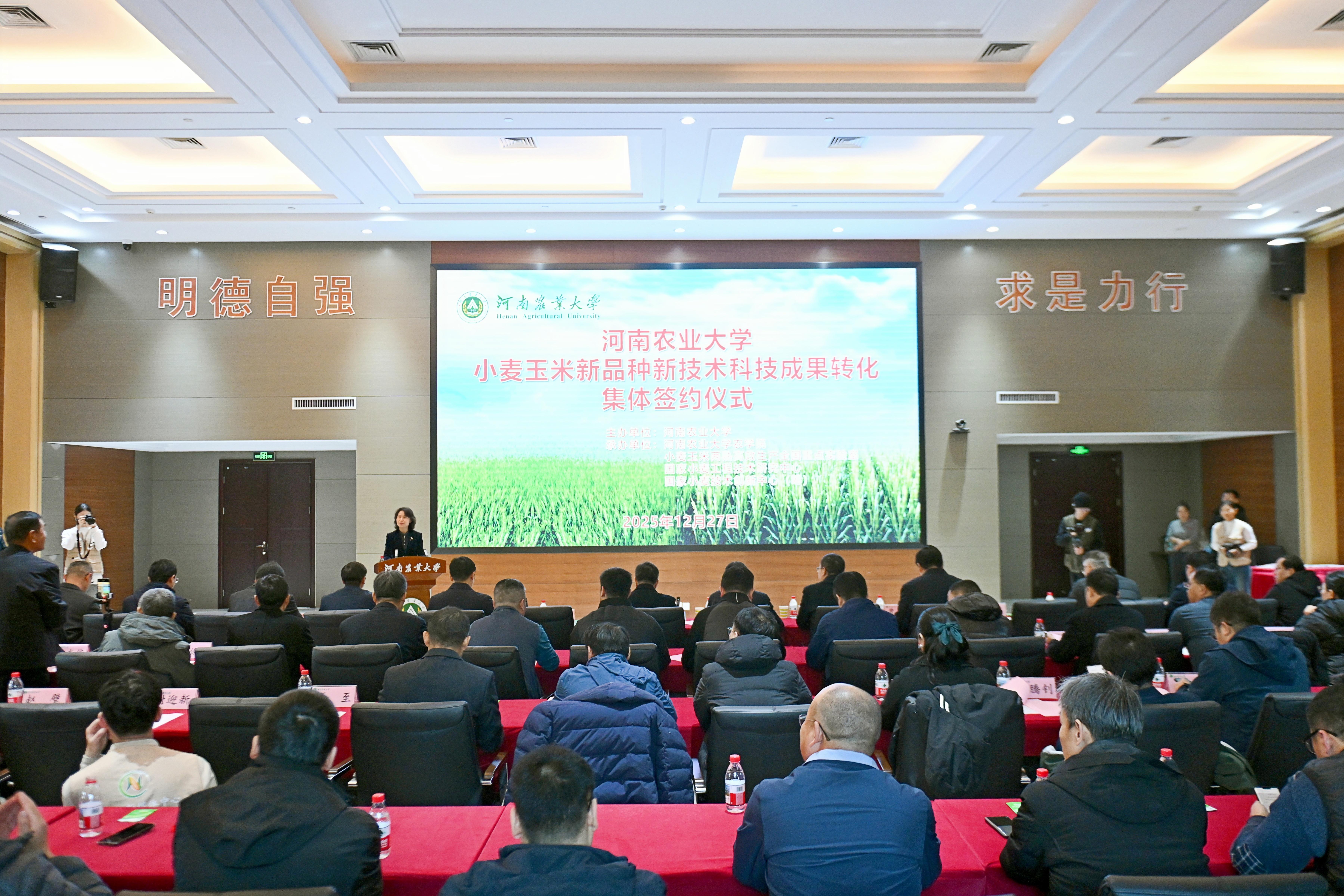 12月27日,河南农业大学农学院举行小麦玉米新品种新技术科研成果转化集体签约仪式,现场签约金额达3863万元。据悉,加上前期已完成的作物新品种转让,河南农业大学农学院全年成果转化总金额累计7220万元,有力彰显了学校在农业科技创新与成果转化方面的强劲实力。