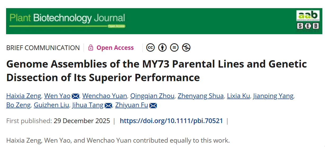 Genome assemblies of the MY73 parental lines and genetic dissection of its superior performance”的研究论文。该研究组装了2023-2025年我国农作物推广面积第一位的玉米品种MY73两个亲本的高质量基因组,并通过与郑单958(Zhengdan958)双亲基因组进行比较,系统解析了MY73高产、耐密、抗病等优异性状形成的遗传基础,并挖掘到株高关键调控基因