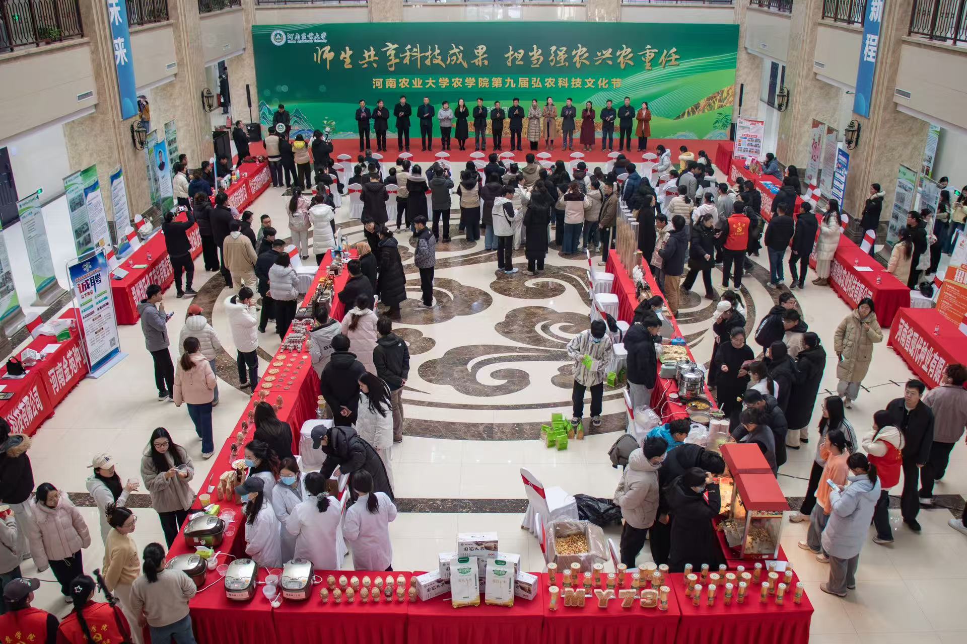 本网讯(通讯员 尹瑞然 图 王奕博)冬寒未尽,春意渐浓。1月6日下午,我院于龙子湖校区第一实验楼一楼大厅隆重举办第九届弘农科技文化节。本届文化节以“师生共享科技成果,担当强农兴农重任”为主题,旨在展示我院在作物研究、科技创新与人才培养方面的丰硕成果,同时搭建就业平台,助力2026届毕业生高质量就业。副校长汤继华、学术副校长王道文、科技处处长郑先波、社会服务处处长赵翠萍、党委宣传部副部长朱瑞萍、心理健康中心主任董方白、校团委副书记张倩、教务处副处长薛晓亚、校友联络办公室副主任闫东、校招生就业办公室副主任鲁兴、党委研究生工作部教育管理办公室主任邓瑛,我院党委书记贾磊、院长陈锋、国家小麦技术创新中心(筹)执行主任、副院长殷贵鸿、党委副书记王金铎、副院长赵建一、李浩川、殷冬梅及企业代表,相关媒体记者以及农学院、植物保护学院、园艺学院、生命科学学院、资源与环境学院的师生代表参加此次活动,开幕式由我院党委副书记王金铎主持。