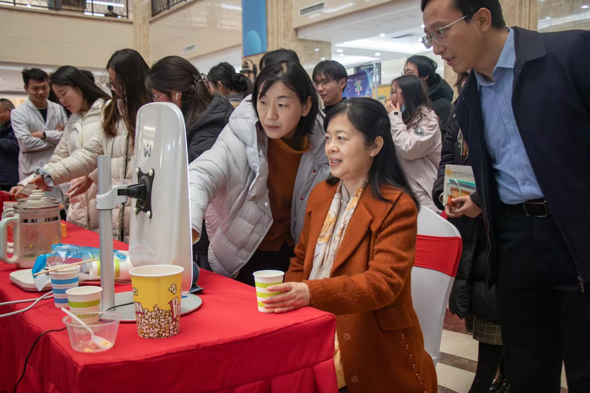 展览现场,与会领导与师生共同参观科技成果。由我院优良小麦品种制作的“超韧纯麦香”小馒头受到领导及师生的品尝及一致好评;高产稳产、优质抗病的玉米新品种黄金粮MY73、黄金棒696、YD268、豫单863等品种,吸引了众多师生咨询了解;富含花青素的黑种皮花生品种“农大黑7572”香脆可口,白皮甜花生“农大白7626”又甜又香、优良玉米品种制作的“农大爆米花”膨爆特性、口感等性状指标上均达到了国内领先水平;被学生纷纷夸赞为“赛博中医”的AI中医体质监测现场,李连珍教授表示,中医发展与时俱进,AI设备借助面诊、舌诊、脉诊等科学分析,可以实时为现场同学给出中医诊断的健康建议并根据个人体质推荐中药茶饮。