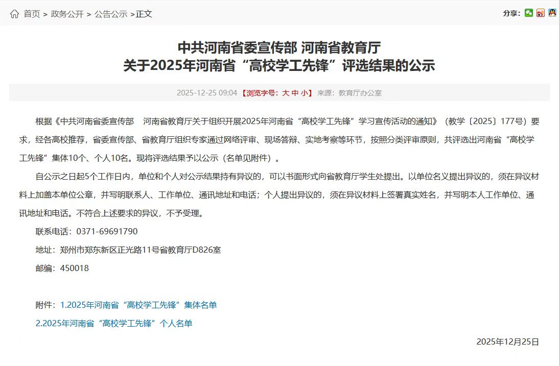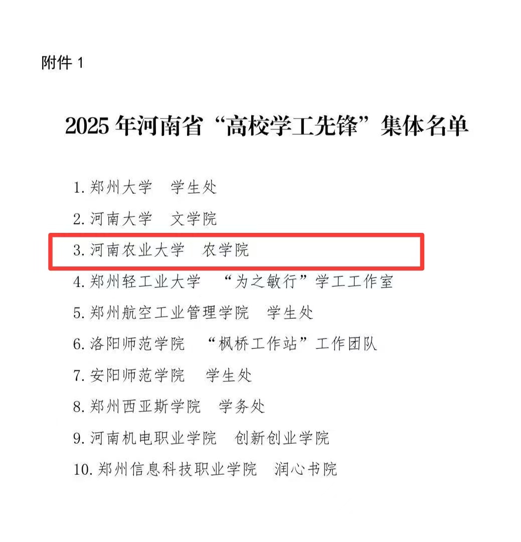 本网讯(通讯员 秦仪雯)近日,中共河南省委宣传部、河南省教育厅联合公布了2025年河南省“高校学工先锋”评选结果,经各高校推荐,省委宣传部、省教育厅组织专家通过网络评审、现场答辩、实地考察等环节,我院凭借党建引领示范强、学生培养质量高、社会关注影响大等鲜明特色,从全省高校院系中脱颖而出,成功获评河南省“高校学工先锋”集体荣誉称号。