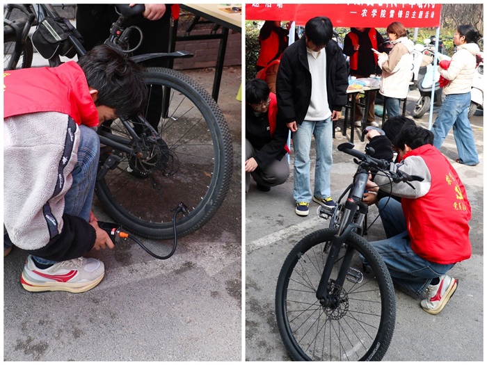 活动现场,中药养生协会志愿者精心调制了多款中药花茶,既有菊花、黄精、玫瑰等传统养生品类,也融入了符合现代口味的新式花茶,将传统养生功效与新式口感体验巧妙结合,邀请师生免费品尝。同时,志愿者细致讲解花茶制作工艺与春季养生知识,以中医药文化传递健康生活理念。此外,他们还特意将热茶送到校园里的保洁阿姨、宿管阿姨和正在施工的师傅们手中,用行动表达感谢,传递温情,展现新时代青年的志愿服务风采。风行单车协会则在校园内设立义务维修点,为师生提供自行车维修服务。面对链条脱落、轮胎漏气等常见问题,志愿者耐心细致地逐一解决,展现扎实的技能与真诚的服务态度。两项特色服务同步开展,现场秩序井然、氛围热烈,吸引众多师生驻足参与。志愿者们以热情周到的服务、扎实过硬的本领践行雷锋精神,生动展现新时代青年甘于奉献、勇于担当的精神风貌。