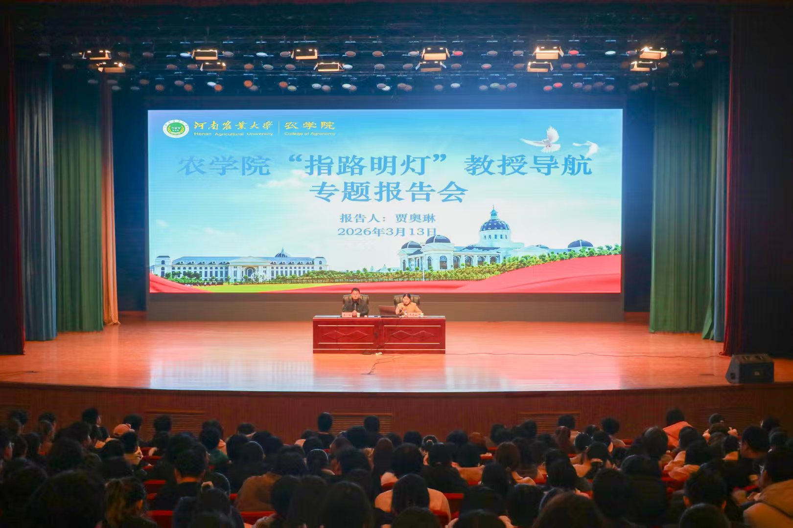 本网讯(通讯员 秦仪雯 图 马敬尧 张潇允)为助力我院学生明确学业发展方向,规划个人成长路径,我院于2026年3月13日在文化路校区千人大礼堂开展“指路明灯”教授导航专题报告会。此次报告会邀请到我院贾奥琳教授担任主讲人,我院2025级全体学生参加,会议由院团委书记唐朝主持。