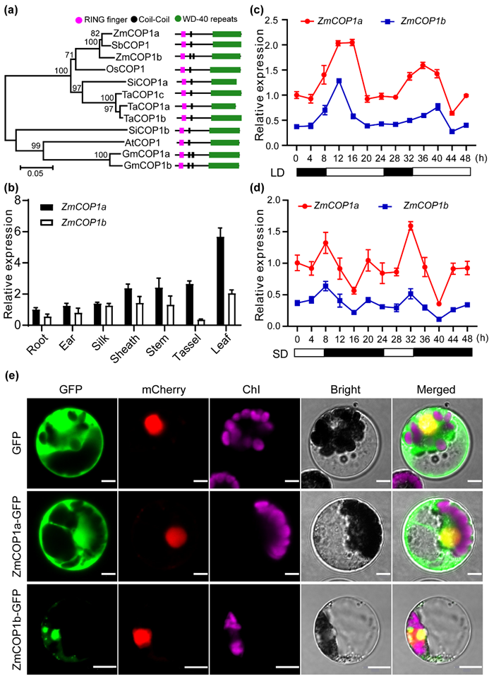 ZmCOP1b。系统发育分析表明,二者与高粱COP1亲缘关系最近,且均含有RING指环、卷曲螺旋和WD40重复结构域(图1a)。组织表达分析显示,两基因呈组成型表达,在叶片中表达水平最高,且