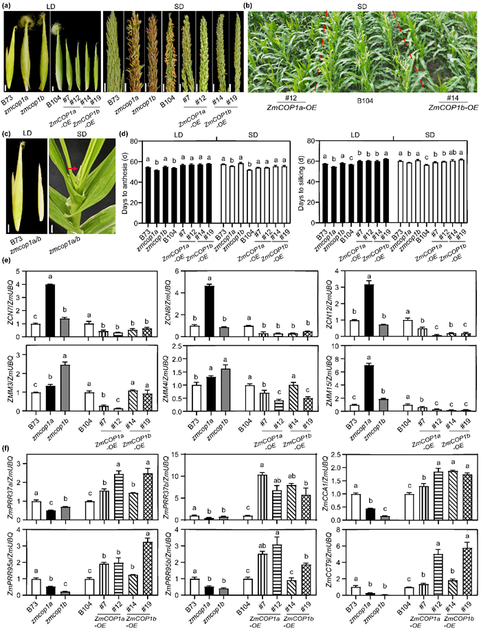 ZmCOP1b-OE)。田间表型分析结果显示,在长日照和短日照条件下,