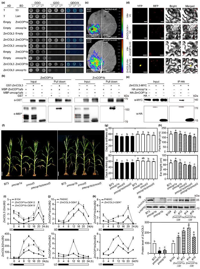酵母双杂交实验鉴定结果显示,全长ZmCOP1a和ZmCOP1b均能与ZmCOL3发生直接互作,而其突变体蛋白则丧失该互作能力(图3a)。该互作关系进一步通过Pull-down、荧光素酶互补(LCI)、双分子荧光互补(BiFC)及免疫共沉淀(Co-IP)实验得到验证(图3a–e)。通过MEMD数据库(http://maizeems.qlnu.edu.cn/)筛选,研究团队获得了一个提前终止的