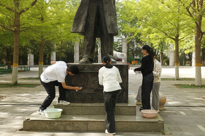 活动伊始,现场师生擦拭吴绍骙先生铜像,随后列队依次献花、鞠躬、默哀,表达对吴老的崇高敬意与深切缅怀。