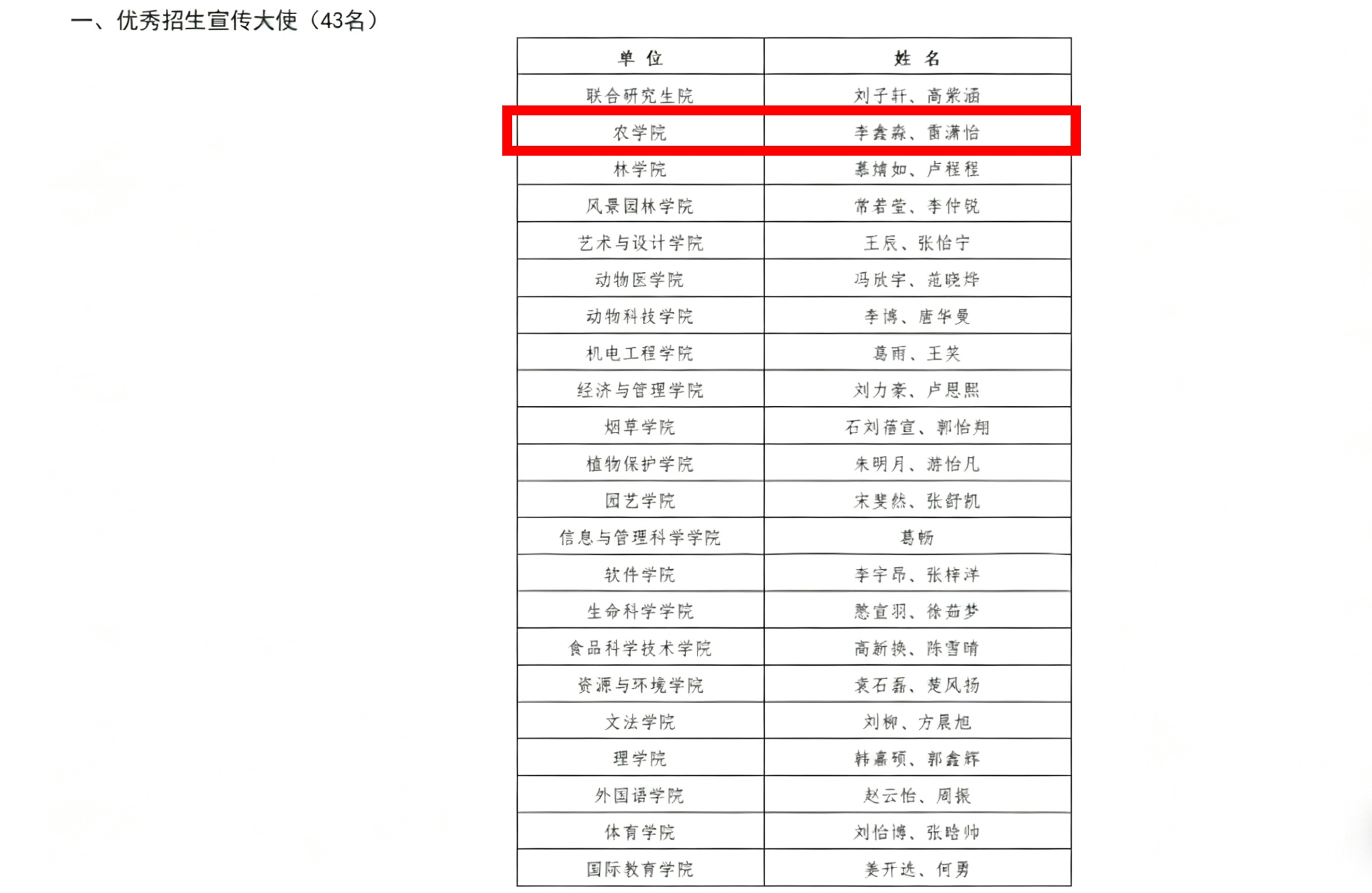 我院学子李鑫淼、雷潇怡荣获“优秀招生宣传大使”称号;由雷潇怡、黄玉钗、郭菲凡、郭雨欣、杨万丽组成的农学院优秀招生宣传团队获评“优秀招生宣传团队”;同时,我院以组织有力、宣传效果突出获评本次活动的“优秀组织单位”。