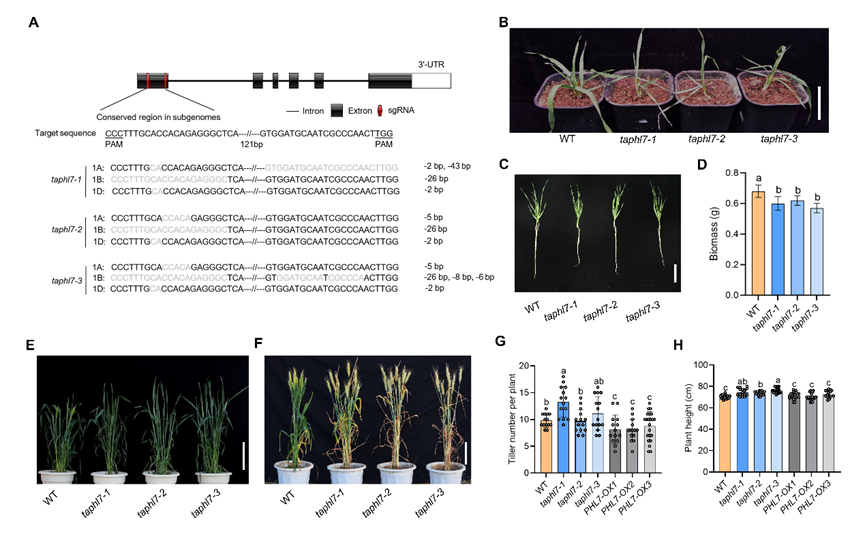 利用遗传转化技术获取TaPHL7过表达和 CRISPR-Cas9 介导的突变 T3 代纯合株系后,将遗传材料在北京、河南两地种植,对其农艺性状调查显示,在幼苗营养生长期taphl7突变体相比较野生型出现窄叶表型;在抽穗期,taphl7 突变体相比较野生型株高增加,分蘖增多,抽穗日期延后 4-5 d;但呈现早熟表型,单株产量增加;而TaPHL7过表达植株中与野生型无显著差异。表明 TaPHL7 在调节植物生长发育中发挥重要作用(图2)。