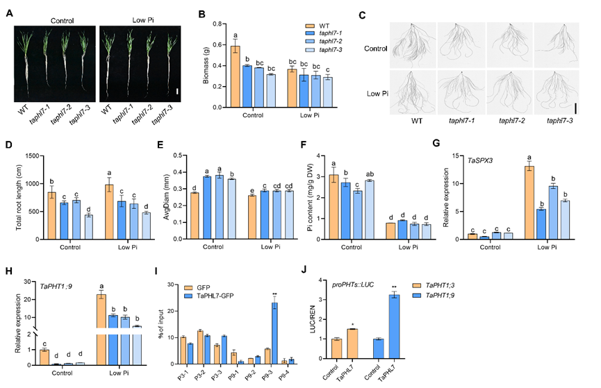 图3:TaPHL7 正向调控 Pi 信号传导和 Pi 吸收